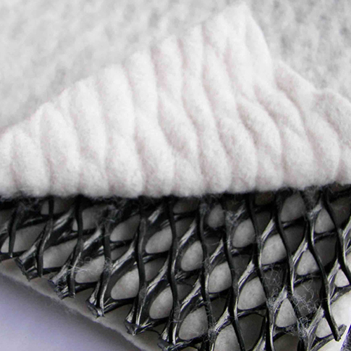 復合排水網是一種新型的排水土工材料。以高密度聚乙烯(HDPE)為原料,經特殊的擠出成型工藝加工而成,具有三層特殊結構。中間筋條剛性大,縱向排列,形成排水通道,上下交叉排列的筋條形成支撐防止土工布嵌入排水通道,即使在很高的荷載下也能保持很高的排水性能。雙面粘接滲水土工布復合使用,具有“反濾--排水--透氣--保護”綜合性能,是目前最理想的排水材料。